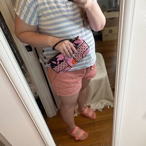 Y2K Loves Me Sunflowers Jazzy Wristlet Clutch by Vera Bradley. Retired pattern pink, orange, and navy floral, zip top closure, and detachable wristlet strap. Interior features two card slots and a multifunction slip pocket. Measures 10.5"x5.5"x1.5". Good pre-owned condition. Please see all photos.