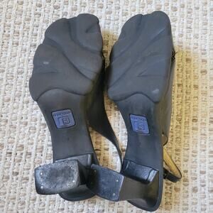 Y2K Vintage Womens 7 Black Leather Slingback Heels Chunky Sole Peep Toe