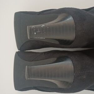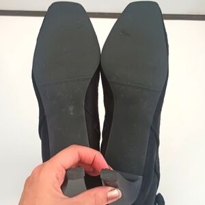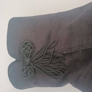 Y2K square toe Studio Works Gable black faux suede leather ankle boots / booties. Size 7 1/2. Tassel accents. Black in color. This item is in good used condition so there are some minor imperfections. Please see the photos.