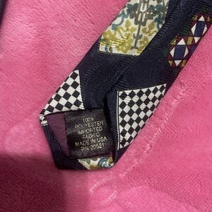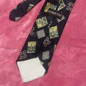 This Y2K vintage Botany 500 men's neck tie features a geometric blue swirl design on a multicolor fabric. The pointed style and classic length make it a versatile accessory for various occasions. Made of polyester in the United States, this tie is a unique addition to any man's wardrobe, blending elements of American abstract art in its abstract design. With its adjustable size and timeless style, this tie is a fashionable choice for those looking to add a pop of color to their outfit.