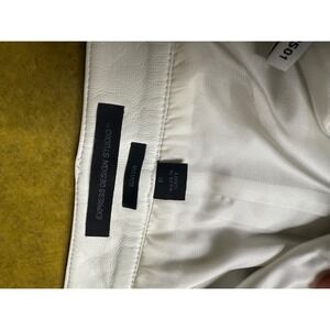 Chic and stylish, a pair of Express Design Studio leather pants. These white leather pants feature a unique floral cutout design on one leg, adding a touch of elegance and sophistication. The pants are designed in a classic silhouette, offering a flattering fit and timeless appeal. Versatile enough to be dressed up or down, they can be paired with a blouse and heels for a night out or with a sweater and flats for a more casual look. Perfect for adding a modern and fashionable touch to your wardrobe, wear these pants to a trendy art gallery opening or a chic rooftop cocktail party.