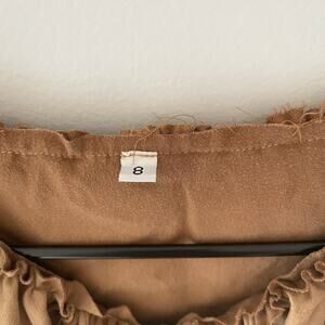 Vintage-inspired faux suede blouse in a soft camel brown, giving off major Y2K Western cowgirl vibes. Features a dramatic ruffle neckline with tie detail, long sleeves, and a flattering silhouette. Made from synthetic suede-like fabric (not real suede) with a vintage looking size 8 tag — please see measurements for best fit.
