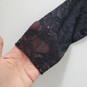 Features: Scoop neckline; sheer floral lace long sleeves; lined body for coverage; slight stretch