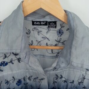 Sheer silk blouse with a moody ombré fade from light blue to black. Decorated with floral embroidery and sequins for a whimsigoth fairy vibe. Lightweight and sheer, perfect for layering.