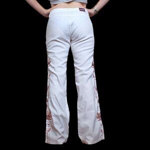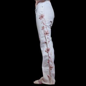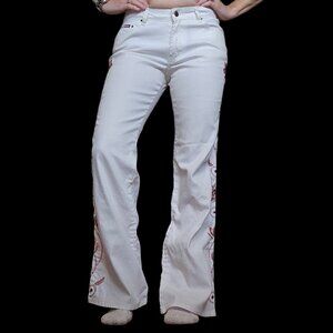 Y2K White Flare Jeans Pants Pink Embroidered Flowers Sz 6 Thin Stretch Retro