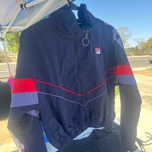 Stylish Fila windbreaker UNISEX. Features bold red and purple stripes. Perfect for casual wear.