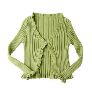 Y2K Women Ribbed Cardigan Sweater Green Knit Ruffle Cottage Coquette Soft Retro