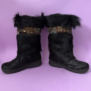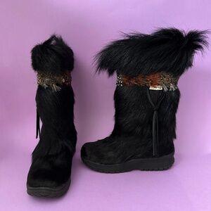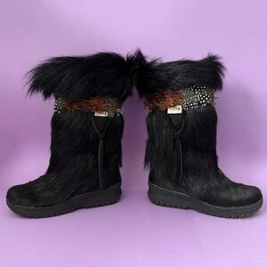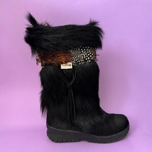 Y2K Women's BearPaw Kola II Black Goat Fur Calf Skin Boots Feather Detail Size 7