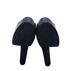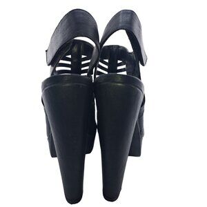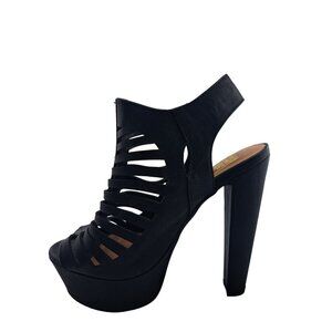Welcome! For sale I have a pair of pre-owned Speed Limit 98 Women Leatherette Black Peep Toe Cage Platform Chunky Heel Sandal shoes.