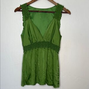 Y2K Women’s Green Silk Sleeveless Smocked Boho Peasant Tank Blouse Fits Like S/M