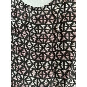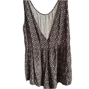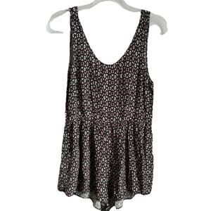 The XXI Women's Size S Romper is a stylish and trendy one-piece outfit featuring a sleeveless design and geometric pattern in pink and black colors. This bohemian-inspired romper comes with shorts and 2 pockets, adding both comfort and functionality to the piece. The set includes a belt and is made from a down fabric type, making it a versatile and fashionable addition to any woman's wardrobe. Made in China, this romper exudes a cool and effortless style that is perfect for casual outings or summer days.