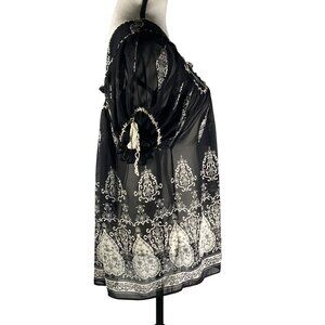 This bohemian-style sheer blouse is ideal for women seeking a chic yet comfortable top. Its elegant black and white design adds a timeless appeal, suitable for various occasions. The polyester fabric ensures durability and easy maintenance.