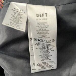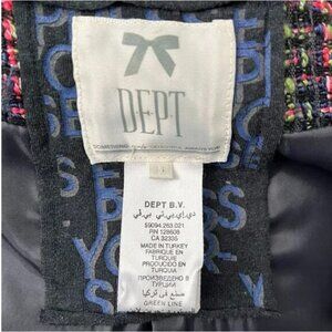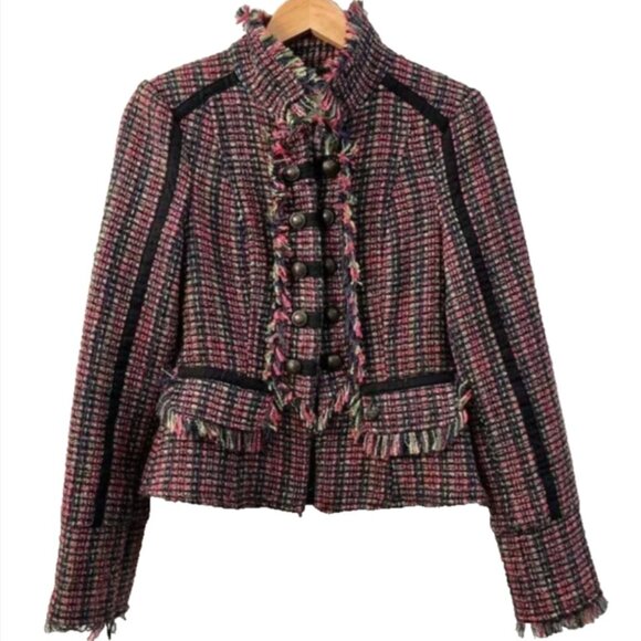 This is colorful military style jacket from DEPT BV, made in Turkey. It is a woven boucle in a plaid pattern with fringe trim on the collar and cuffs. It has 5 metal buttons up the front on each side for decoration with hidden hook and eye closures up the entire front. There are two button accents on each sleeve. It also has a signature DEPT heart charm on the lower left side.