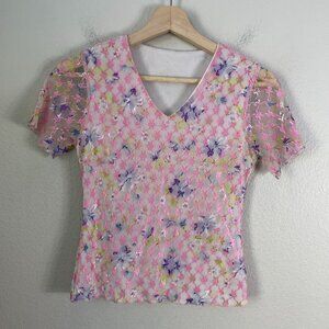 Y2K Womens XS Floral Mesh Short Sleeve V Neck Top Stretch Shirt Fairy Romantic