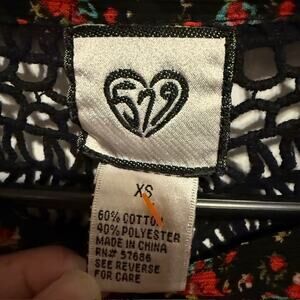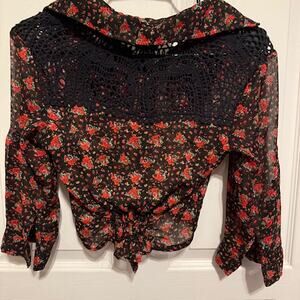 Y2K Women's top - 579 Brand - Black Floral Tie Front 1/4 Sleeves XS