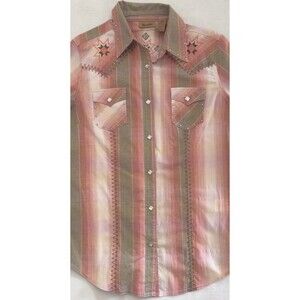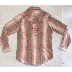 Y2K Wrangler Western Shirt Aztec Pearl Snap Embroidered Pink Stripe Womens Med