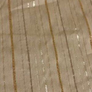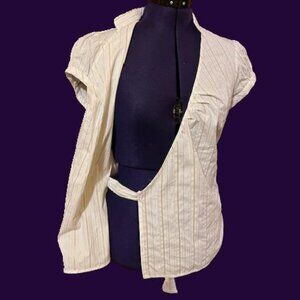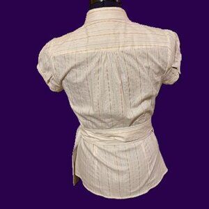 White wrap style dress shirt with metallic gold and silver stripes throughout.