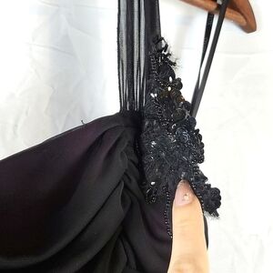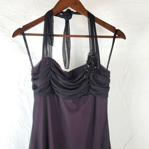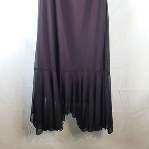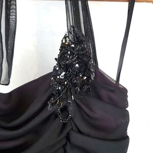 Y2K XOXO whimsigoth fairycore halterneck midi dress. Asymmetrical hem. Sheer black overlay with fuchsia underneath. Adjustable tie back halterneck. Good condition, beaded applique at strap is coming loose but can be fixed with some stitches or glue. Size medium.