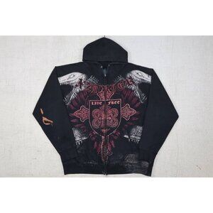 The distressed black wash, “Live Free” chest graphic, and Affliction-style elements make this a standout piece for collectors or fans of vintage alternative streetwear.