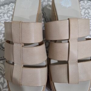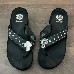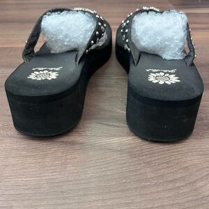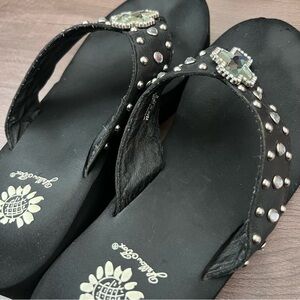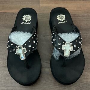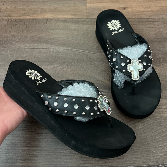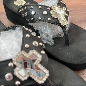 Y2K Yellow Box Precedent Wedge Rhinestone Embellished Cross Flip Flops Size 8