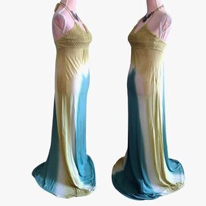 Y2K Yellow Green Tie Dye Viscose Embroidered Halter Maxi Dress Medium