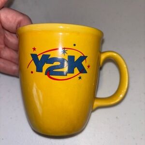 This vibrant yellow and blue ceramic mug from Source Unknown is a delightful addition to any dining collection. Featuring a playful cartoon character and a bold Y2K logo, it brings a touch of whimsy to your drinkware. The mug's ergonomic handle ensures a comfortable grip, perfect for savoring your favorite hot beverages.