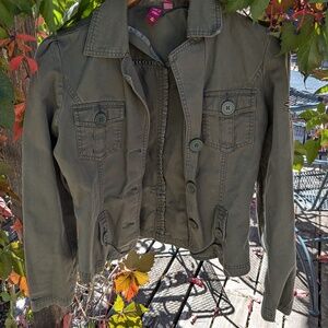SO - so real so right, brand, light army green jacket with chunky buttons, slight poof shoulder, chest pockets, strap and buttons belt/tool loops, and scout inspired embroidered patch on the upper left sleeve. Size Medium, but the fit is honestly fairly petite. 100% cotton.