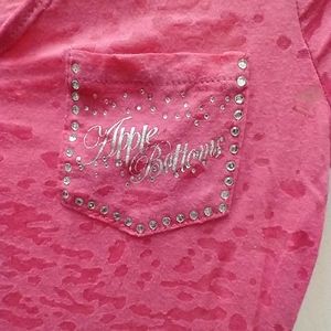 Beautiful throwback Y2K authentic 🍎 Bottoms cap sleeve tee with rhinestone embellishments. All the rhinestones are intact, however part of the bottom seam is unraveling as you can see from the photo. Otherwise the condition is great, and the bright magenta is an attention grabber. As it may be difficult to see, this top is very sheer, almost see-through. What a fantastic addition to your closet this little gem could be.