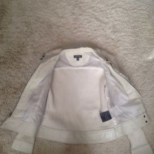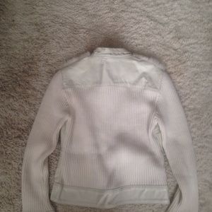 Vtg Ivory Fur Front Sweater Jacket. Medium weight sweater jacket with leather and fur trim with removable trim collar. Mock neck with zipper and snap button closures on neck and wrist.