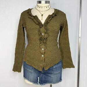 Y2K fairy grunge olive green crinkle ruffle button top by Nomadic Traders. Fabric has intentional small holes, size large