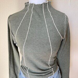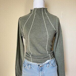army green, fitted turtleneck, light stitching, grunge aesthetic, whimsy goth, fairy style, pilled fabric, casual layering, light olive, vintage-inspired