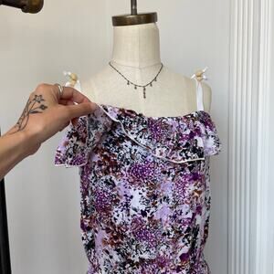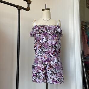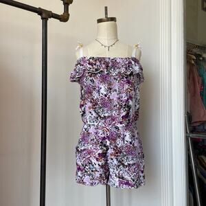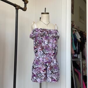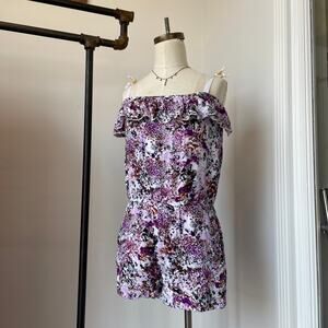 Super cute purple floral romper with ruffle and wooden beads on straps! By the brand JL, labeled a size small, 100% rayon. Good vintage condition and has pockets.