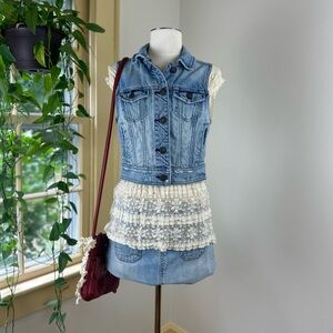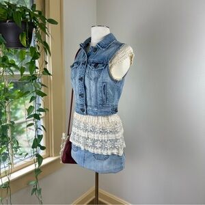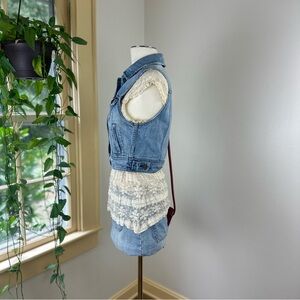 Classic light wash denim vest with a cropped fit and button front closure. Features chest pockets, adjustable back tabs, and sturdy 100% cotton construction. Perfect for layering over dresses, tanks, or tees for that true Y2K, festival, or grunge-inspired look.