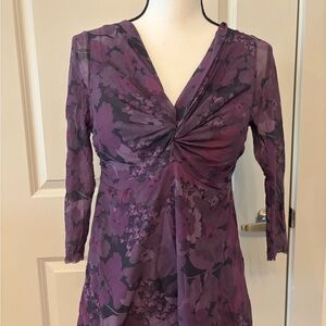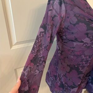 Cute and trendy Y2K flowy and ruched top with purple floral pattern