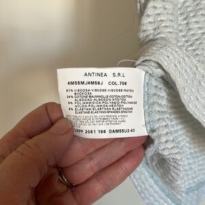 Silly, textured dream with lots of stretch. Ice blue and the teensiest boy sheer (see video with my hand inside the shirt.) EUC