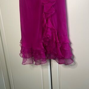 Beautiful 100% silk chiffon bright and vibrant pink strapless formal cocktail dress. Y2K vintage. In excellent condition, small imperfection under the armpits where the dress was on a hanger as pictured. Hanging straps have been cut out. Perfect for wedding guest, homecoming or other party formal events. Top has boning to help with structure.