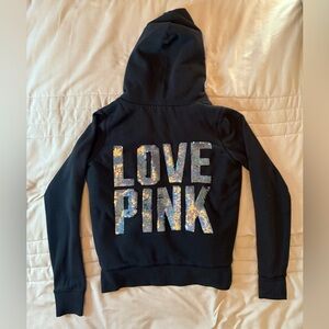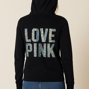 Rare Y2K vintage Chic black Faux fur lined hoodie with glittery 'Love Pink' design. Soft lining for comfort. Ideal for casual wear.