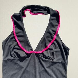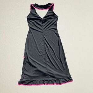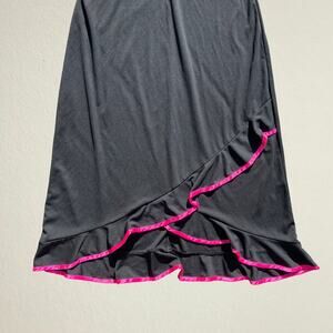 Vintage Y2K black ruffled halter dress with pink trim and asymmetrical hem. 2000s. Excellent condition pre owned. Pit to pit measures 16". Pit to hem is 32". Best fits size medium.