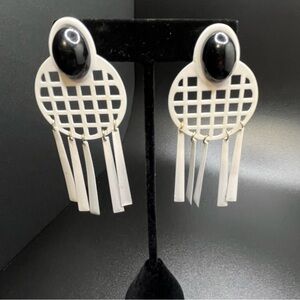 lightweight y2k statement earrings featuring a white grid-style cutout design topped with a glossy black faux onyx cabochon. each earring has long dangling plastic fringe that moves beautifully when worn. bold and geometric, perfect for 90s and early 2000s retro fashion lovers.