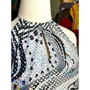 Amazing glam rock mirrored mixed psych print halter top by iconic Y2k brand Self Esteem. Features coolest choker hardware at the neck and key hole st the neckline. Print is a mix of psychedelic swirl and polka dots. Holographic sequin-like dots throughout provide killer movement. An absolutely ideal party top. Material is a poly-spandex blend that lends a few inches of stretch. Marked a size large but please check measurements below, it reads more a modern medium! Excellent vintage condition - no flaws!