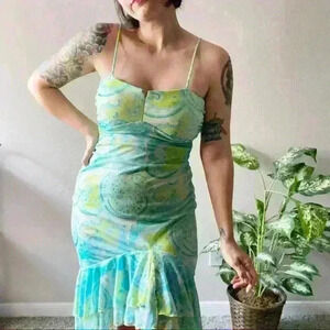 Y2K paisley lined asymmetrical tiered ruffle dress. Cami straps. Bust is padded. Tag reads as a size small. It’s modeled here on a size medium who is 5’1 and 130 lbs for reference. There is no zipper, the dress just slips on. Has stretch. Would recommend for a small or medium. Could also be cute as a Tinkerbell costume!
