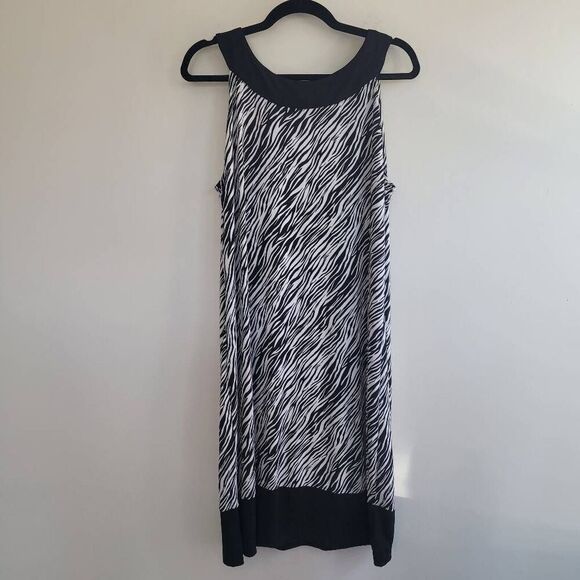 Y2K zebra print sleevless shift dress scoop neck midi knee length. In excellent pre owned condition with no signs of wear or damage. The material is medium weight and kind of slinky.
