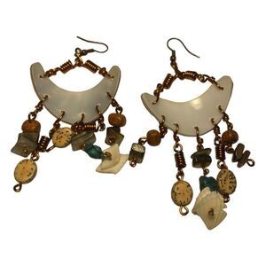 Y2K Beaded Sea Shell Earrings Bronze Tone Metal Dangle Coastal Tropical Tribal