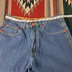 Y2K Brooklyn Bklyn Xpress Skater Grunge Rave Loose Jeans, colorful stitching throughout and Floral Embroidered back pockets, 100% Cotton.