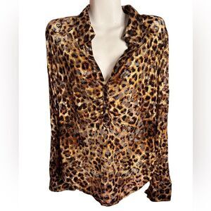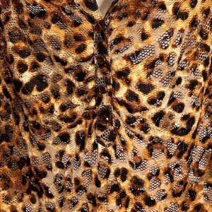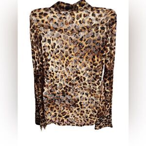 The Y2K Cache Leopard Top is a daring, retro-inspired piece crafted from lightweight, sheer fabric for a sultry and edgy look. The top features an all-over leopard print in rich, earthy tones, embodying the bold style of the early 2000s. Designed with a fitted silhouette, it has a slightly stretchy construction that hugs the body, long sleeves, and a subtle v neck . Ideal for layering over a bralette or wearing on its own, this top adds a statement-making touch to any outfit, pairing seamlessly with high-waisted jeans or a sleek leather skirt for an unforgettable ensemble. Size L