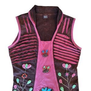 - Brown & black, with colorful floral patchwork embroidered appliques (hot pink, teal, blue, green, yellow & red colors)