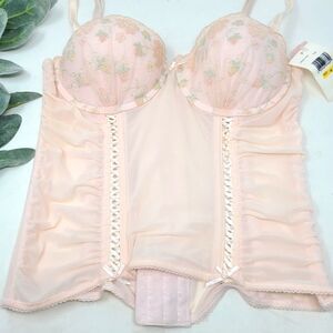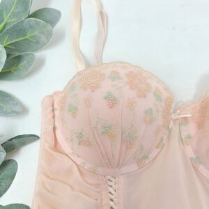 Women's beautiful Y2K style corset top. It is a light blush pink with embroidered berries on the bust. It has 3 rows of hook and eye closures down the back for size adjustment. It is new with tags, but one strap has some spots on it. I did not try to remove due to it being new with tags. Please all photos. Thank you so much for looking. I am always open to reasonable offers. Have a fantastic day!