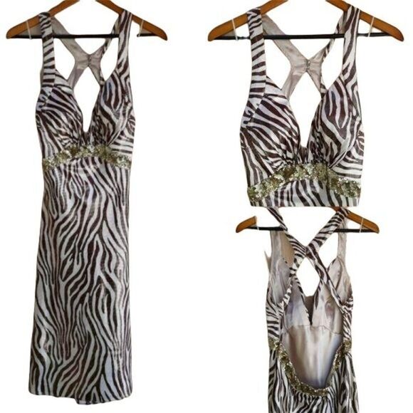 Y2K La Femme Racerback Dress 10 Formal Metallic Bronze Zebra Plunging V Strappy