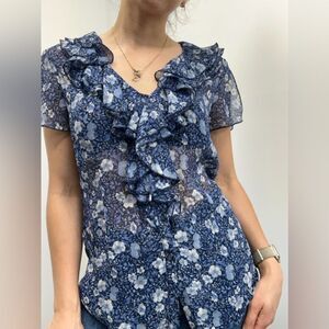 Y2K Oscar De La Renta Blue Floral Ruffle Short Flutter Sleeve Blouse Size 8