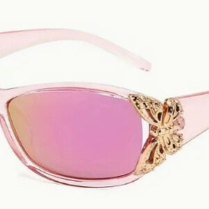 Pretty pink sunglasses with gold butterfly on each side.